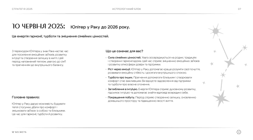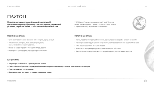 Практичні поради, адаптовані під вашу натальну карту. Конкретні дати для важливих дій та чіткі інструкції для досягнення цілей.