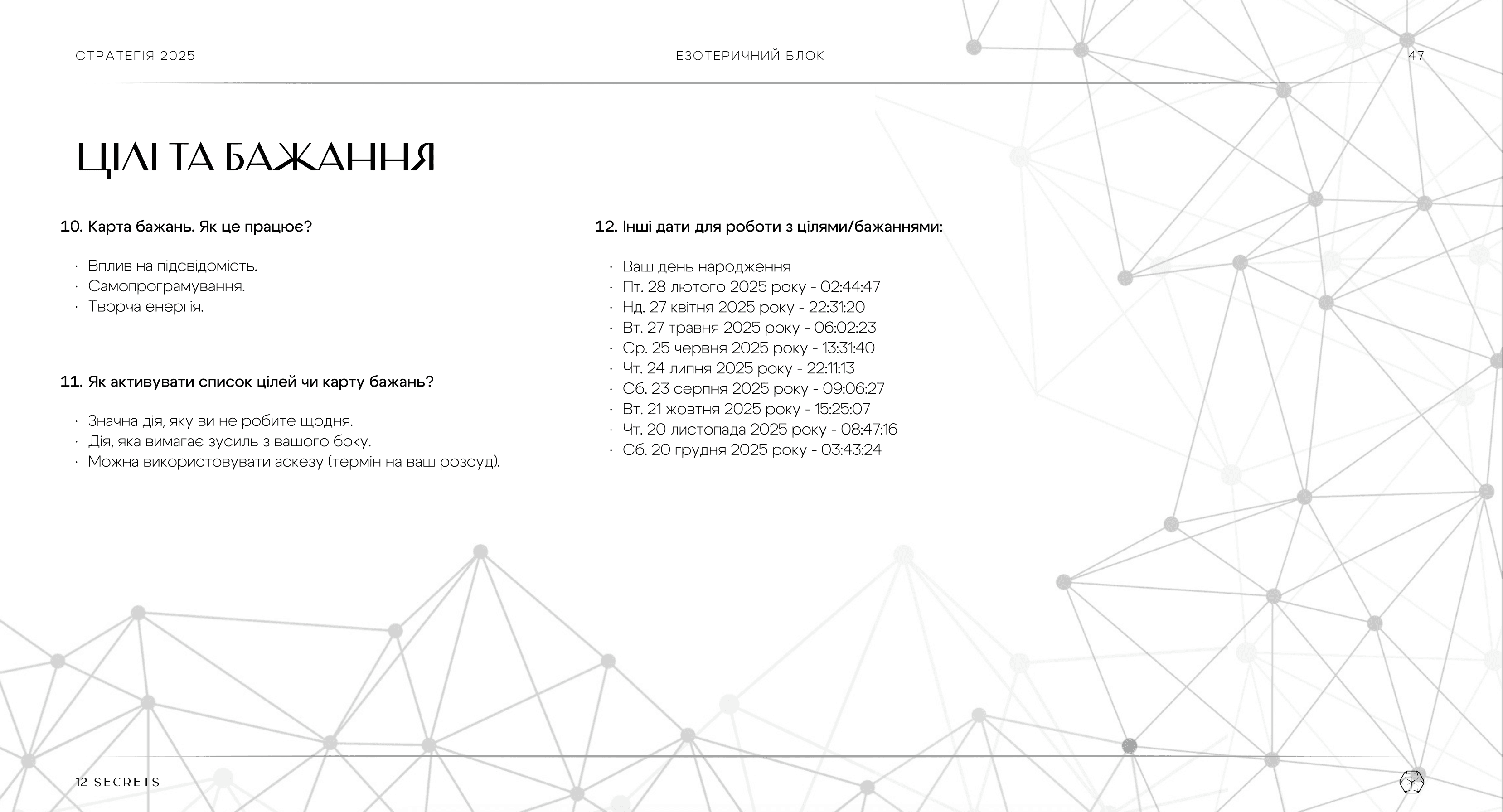 Протягом 48 годин ви отримаєте на вказану вами почту файл з персональними астрологічними даними. На базі них та матеріалів особистого кабінету ви зможете побудувати власну стратегію на 2025 рік.
