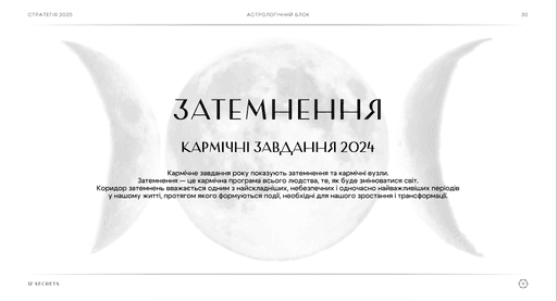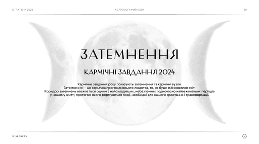 Попередження про складні періоди та конкретні рекомендації щодо їх проходження. Практики для захисту енергії та підтримки балансу. Кармічні завдання року для кожного.